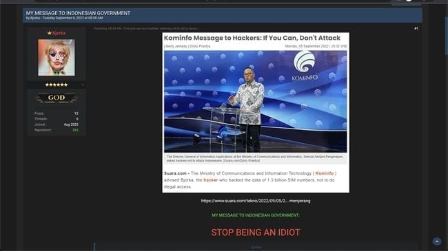 “My Message to Indonesian Goverment: Stop being an idiot (pesan saya untuk pemerintah Indonesia: berhentilah jadi orang bodoh, red),” demikian dikutip dari utas di BreachForums, Selasa (6/9) pukul 08.58 WIB itu.